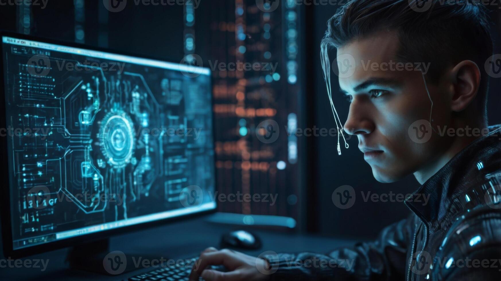 Young man working intently on futuristic computer with digital interface in dark technology environment Pro Photo