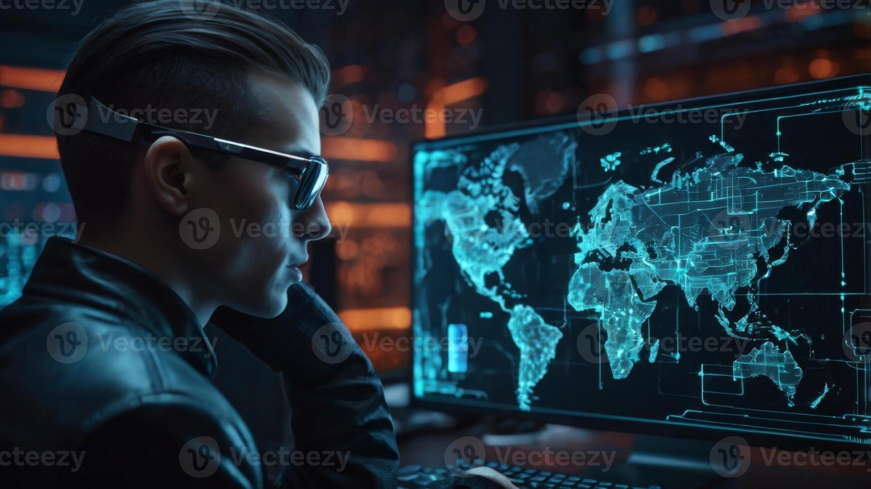 Futuristic male analyst working on computer with global map display and cyber elements in a high-tech environment Pro Photo