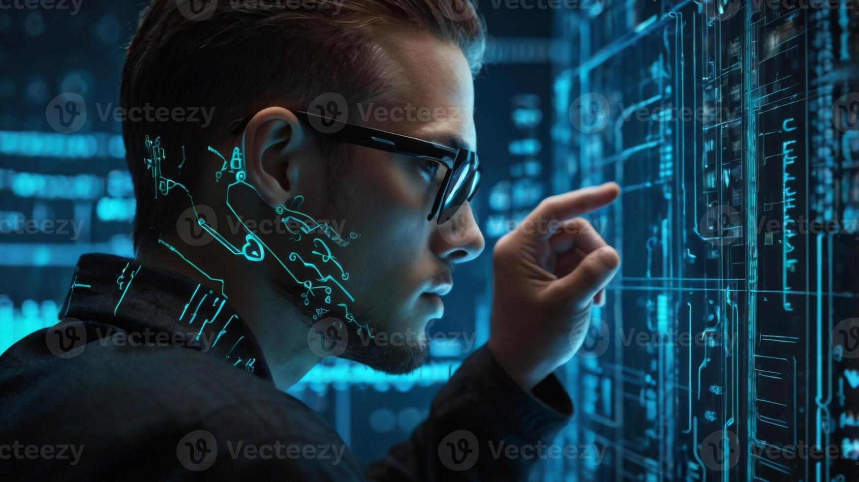 Young man analyzing digital data on a futuristic interface with glowing circuitry patterns and technology background Pro Photo