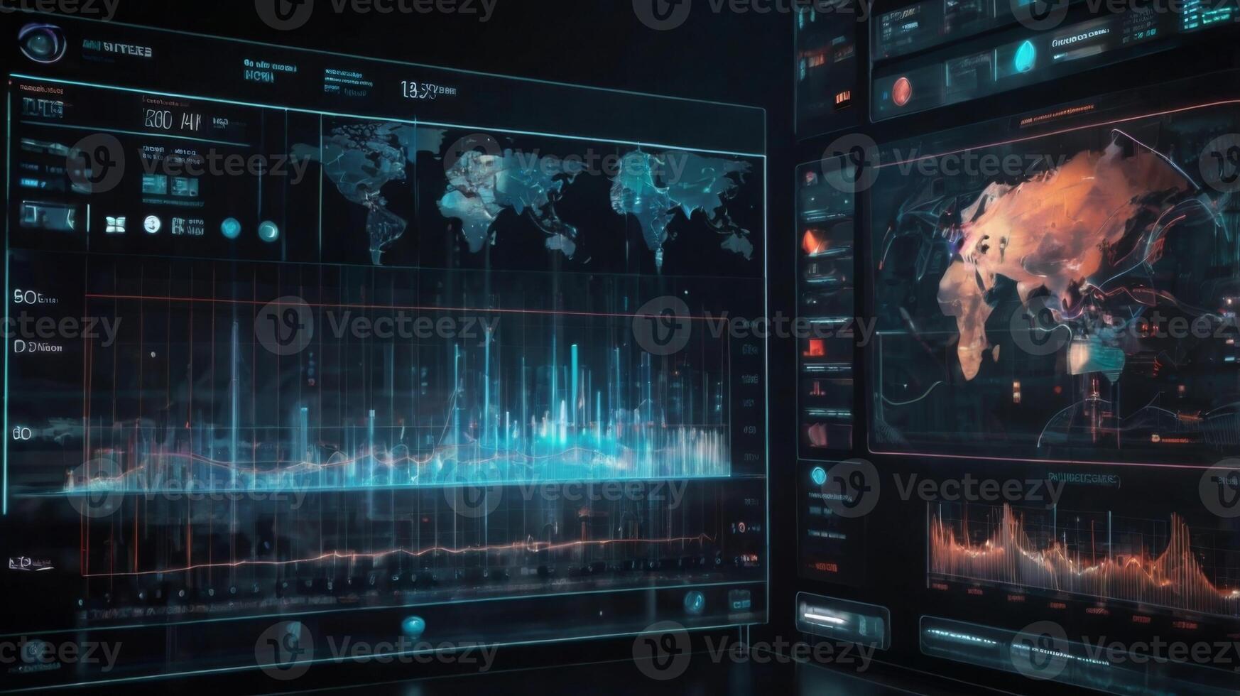 Futuristic Data Visualization with Global Maps and Financial Metrics in a High-Tech Environment Pro Photo