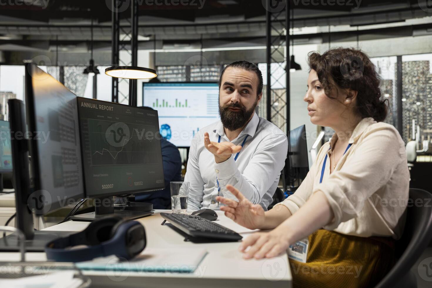 Executive team working together on report writing at the workstation, collaborating on building a new development strategy. Reviewing insights to enhance efficiency and progress. Pro Photo