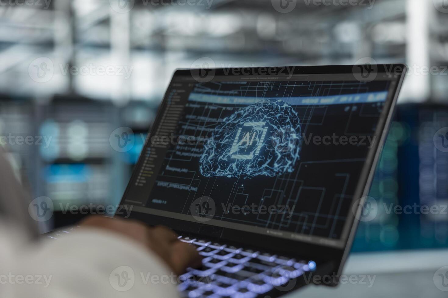 Close up of engineer using laptop in data center housing advanced infrastructure used for AI workloads. Server room IT professional running artificial intelligence code to reduce rigs latency Pro Photo