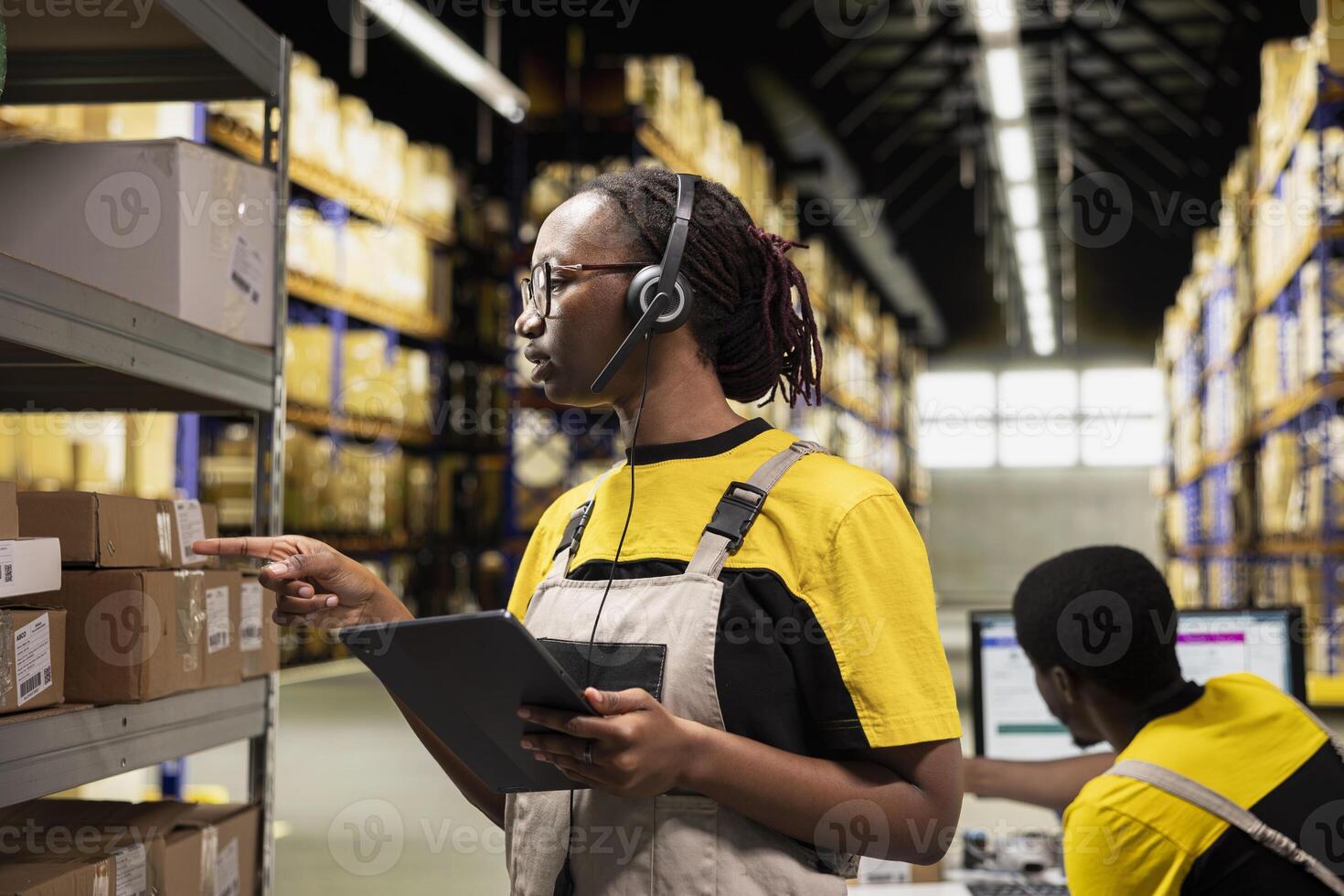 Call center female worker answers help line call in a logistics warehouse, updating clients on orders and resolving cargo mix ups. Managing inventory control in order to fix barcode issues. Pro Photo