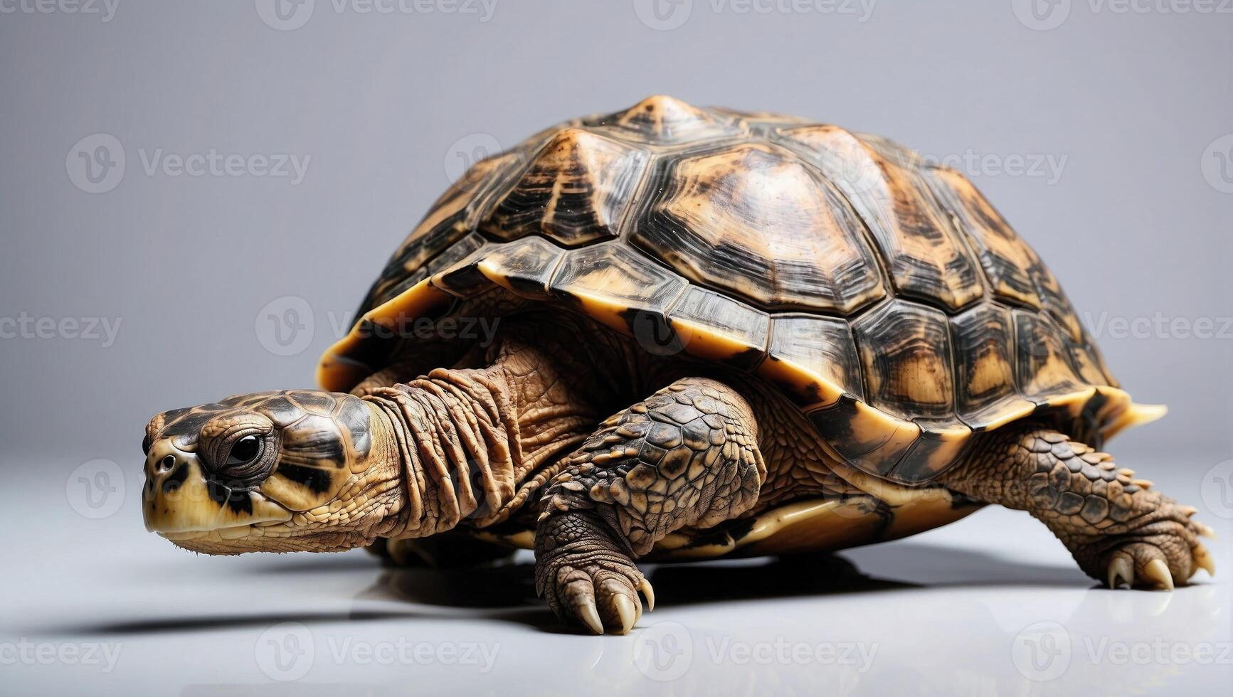 A detailed close up of a tortoise showcasing its distinctive shell patterns and textures. Pro Photo