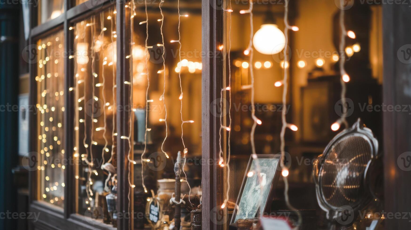 Storefront Window With String Lights During Evening in Autumn Pro Photo