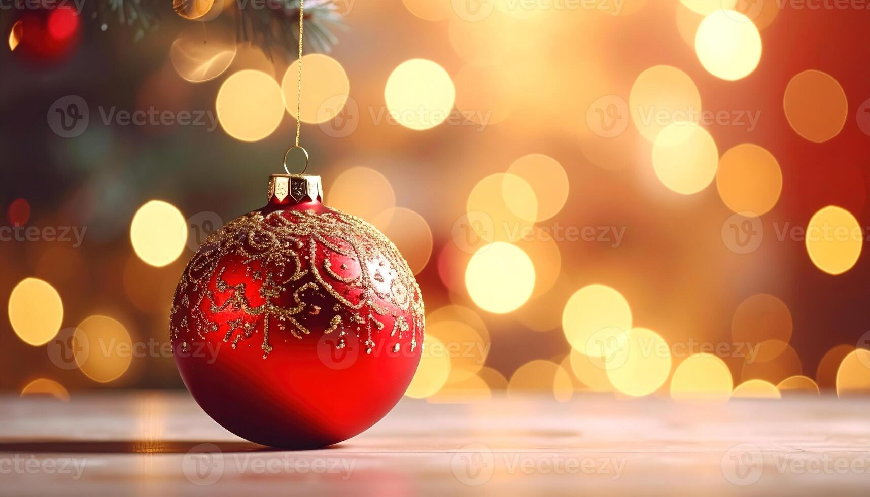 A close-up of a vibrant red ornament with gold filigree, hanging from a tree branch. Soft, golden bokeh lights illuminate the background, creating a warm and festive atmosphere Pro Photo