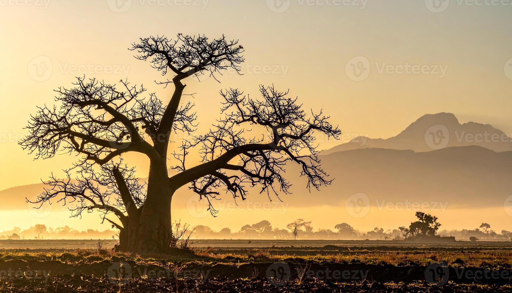 A silhouetted, large tree dominates a hazy, warm-toned landscape. Mountains fade into the distance, creating a peaceful, golden-hour scene. Barren fields and other small trees add depth Pro Photo
