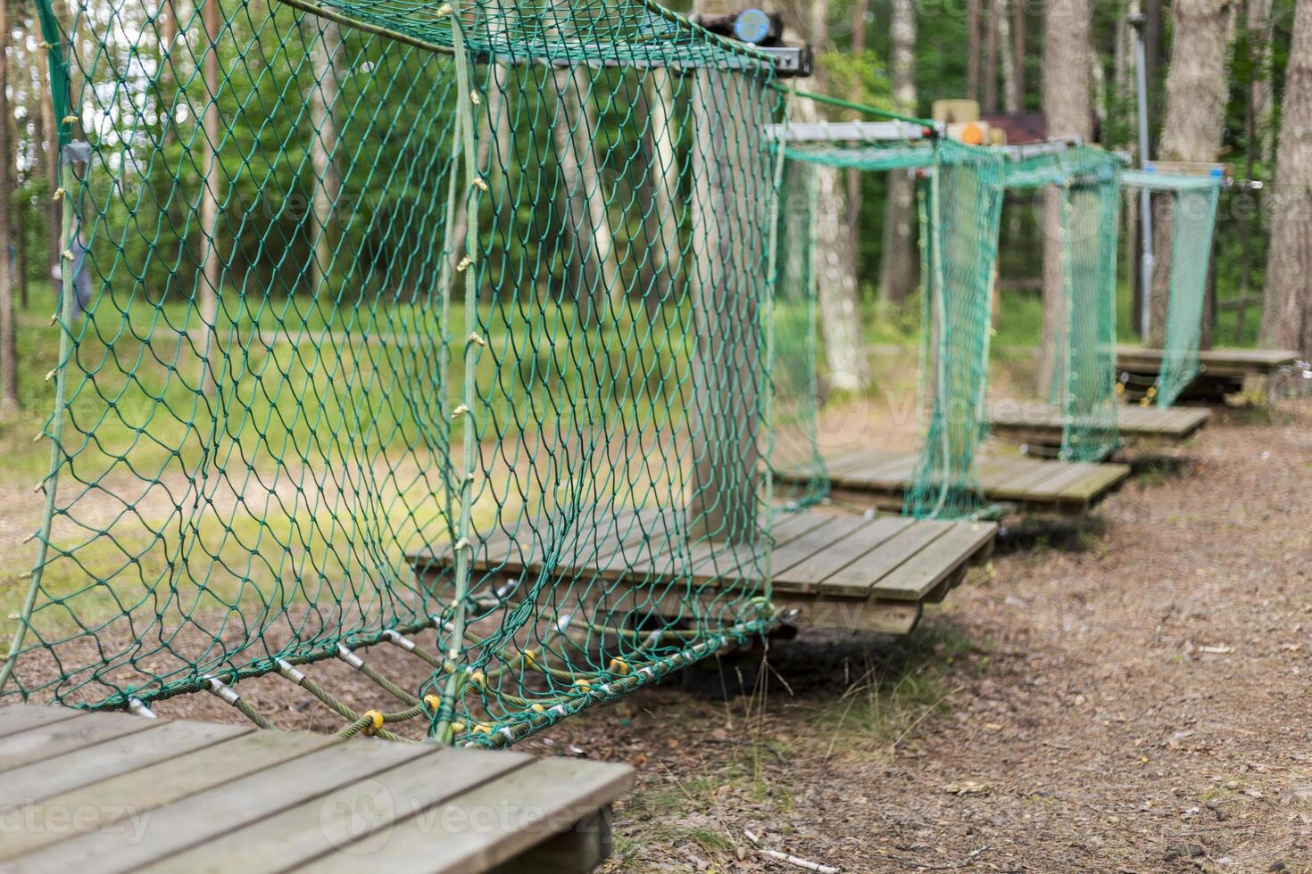 Kids and adults explore netted climbing structures in a forest setting. The green nets provide an engaging way to foster physical activity and adventure Pro Photo