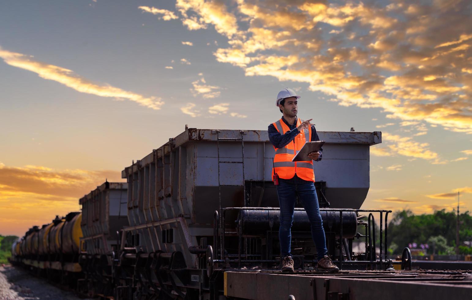 Engineer railway under  checking construction process train testing and checking railway work on railroad station with radio communication .Engineer wearing safety uniform and safety helmet in work. photo
