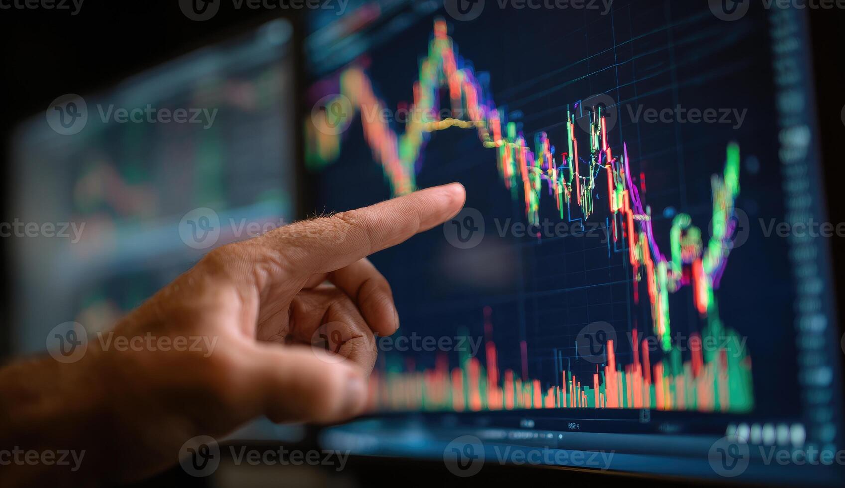 Hand points at a complex stock chart on multiple computer screens Pro Photo