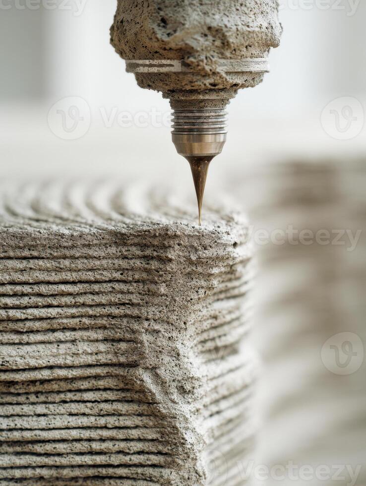 Industrial 3d printer nozzle extruding layered concrete material to create a textured and sturdy architectural structure with precision and modern technology Pro Photo