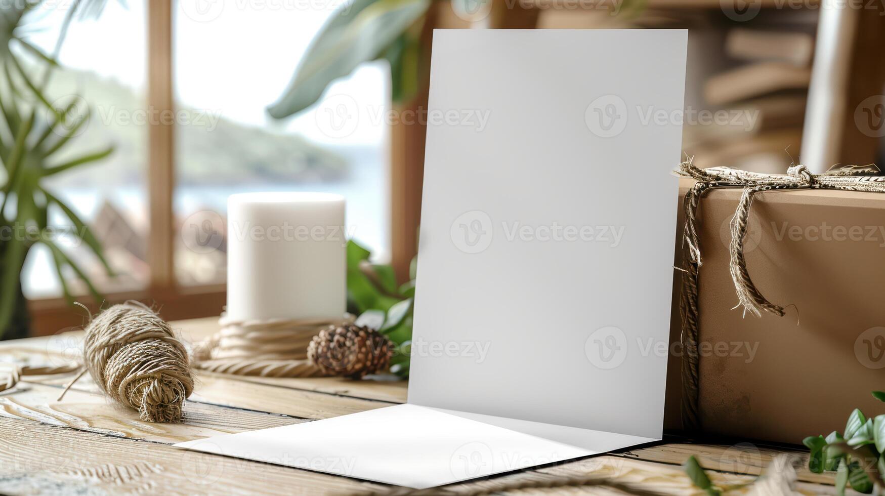 Blank Card on Rustic Table with Nature Background and Items Pro Photo