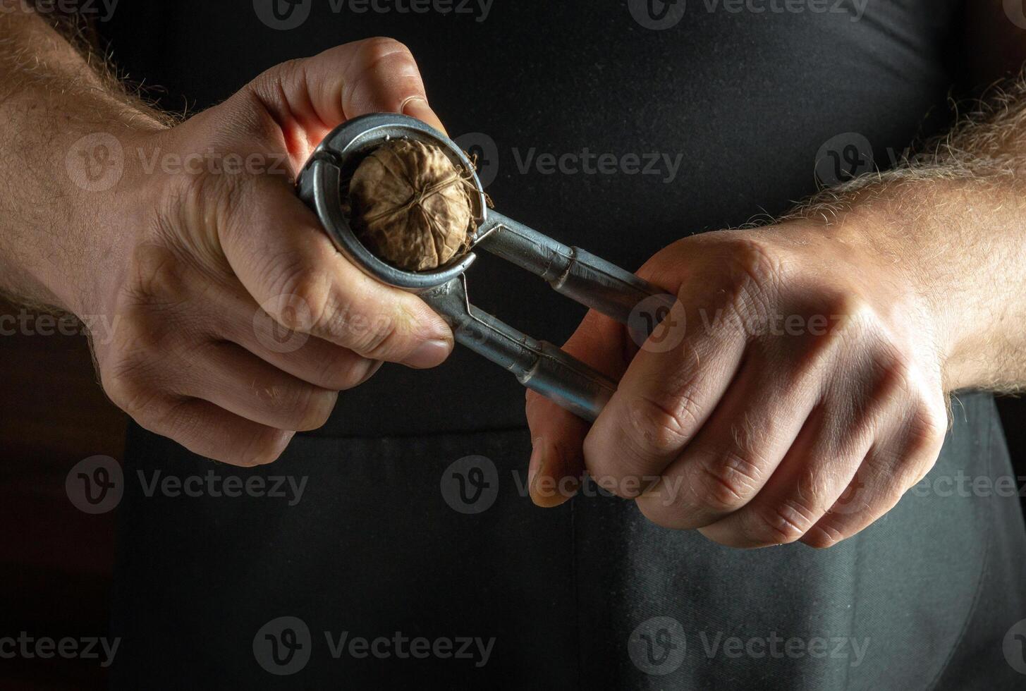 Hands skillfully use a metal nutcracker to break open a walnut, revealing the rich, textured shell and inner nut. The warm ambiance adds a touch of tradition and craftsmanship to the moment. Pro Photo