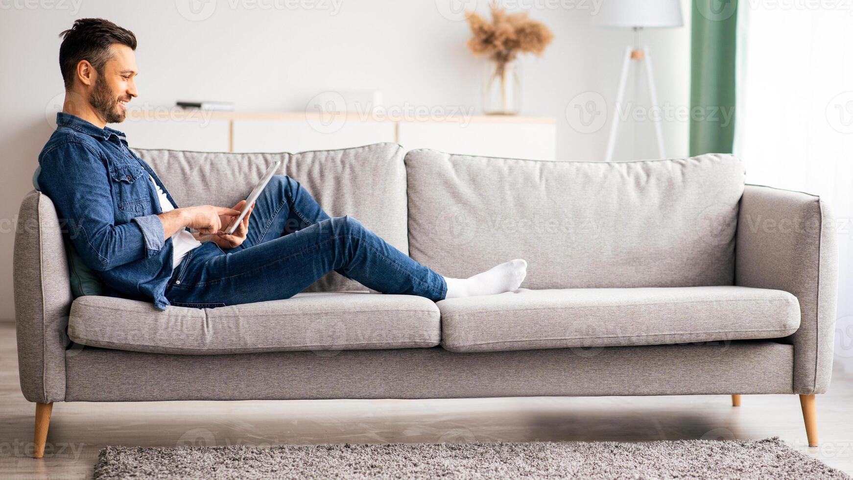 Handsome bearded man using digital tablet while resting at home, side view, copy space. Relaxed middle-aged man reclining on couch in living room, watching movie or using mobile applications Pro Photo