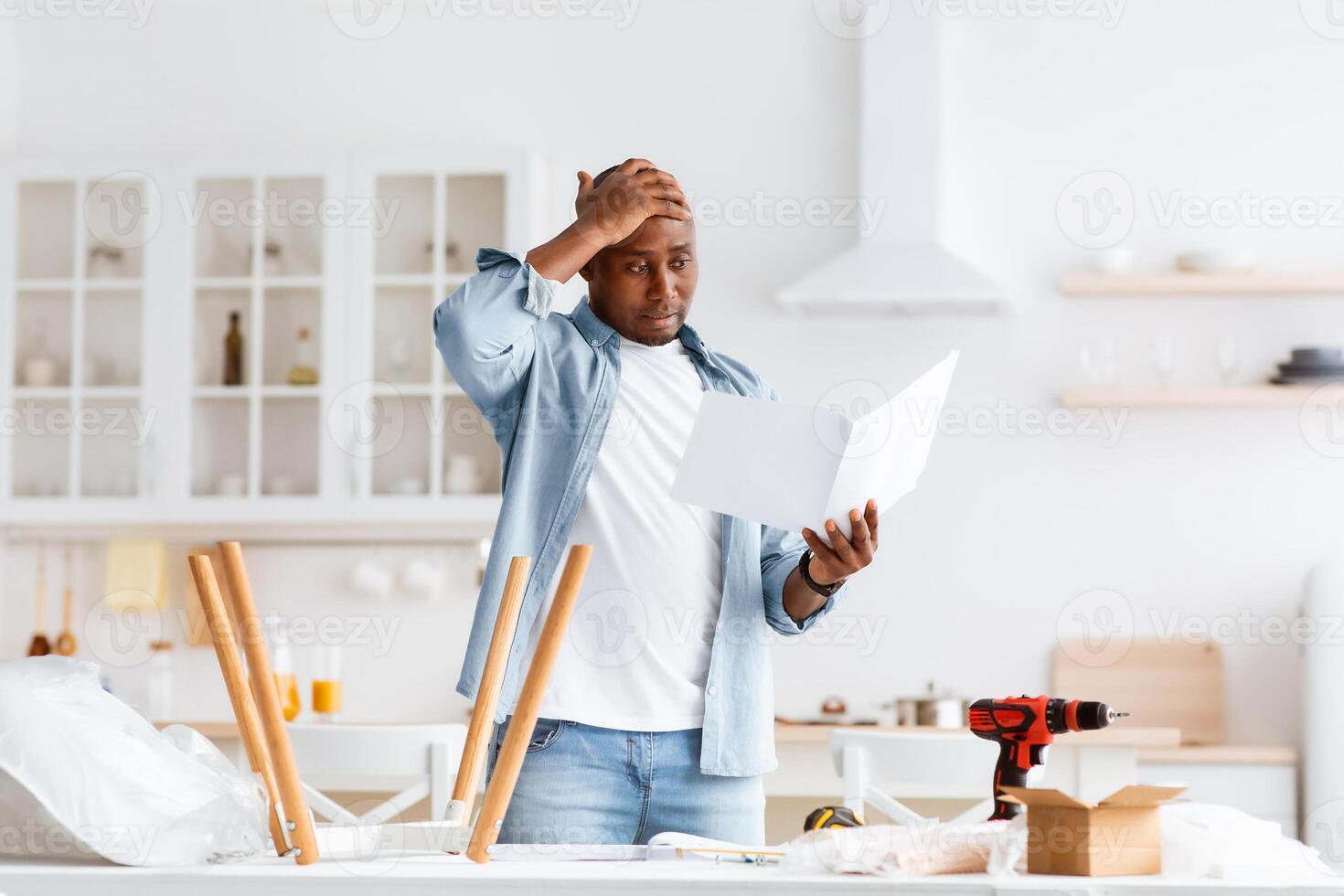 Difficulties and problems in assembling of new furniture. Confused african american man reading instruction in kitchen interior with tools and details on table, free space Pro Photo