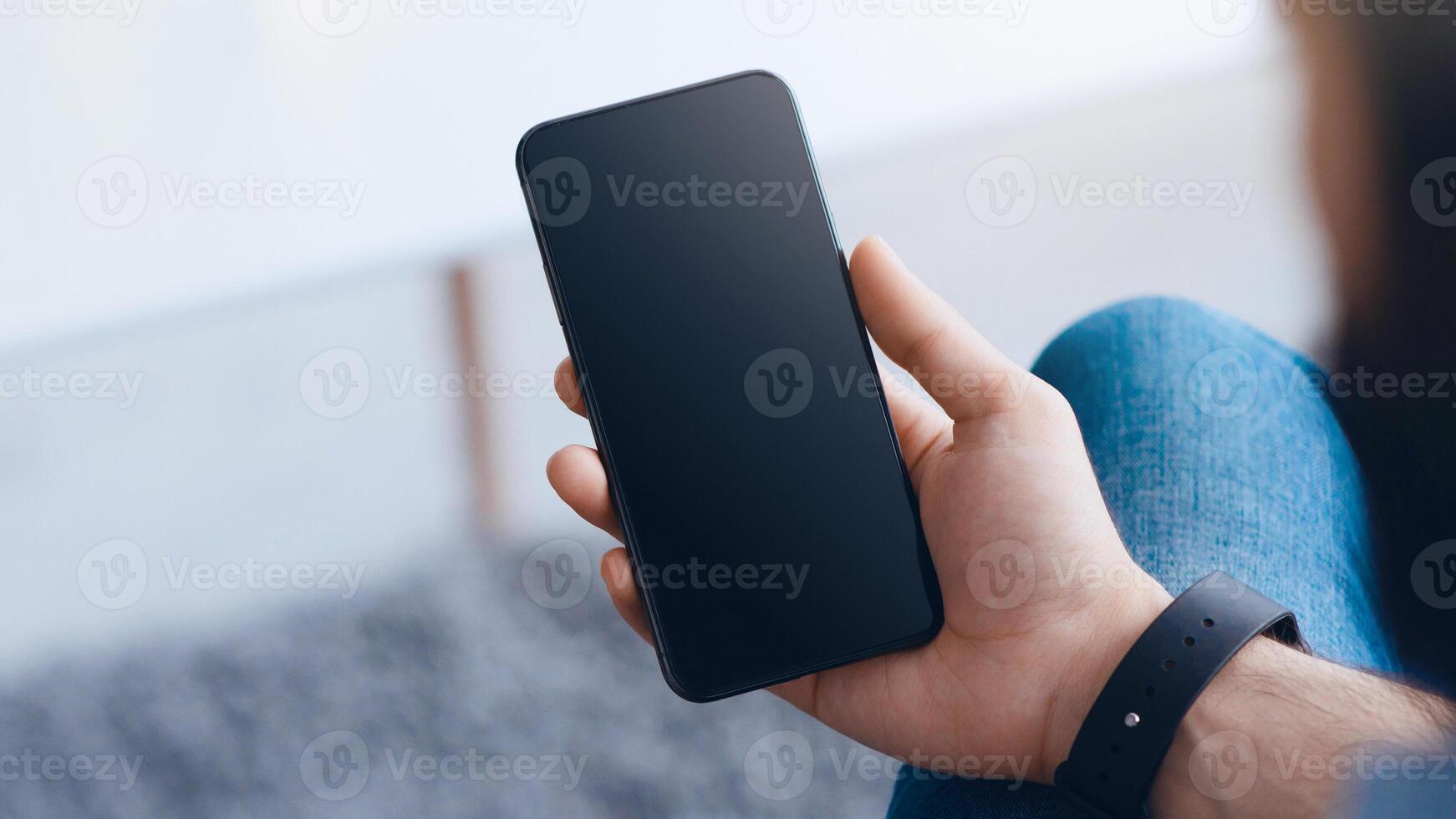 Over the shoulder view of unrecognizable man using cellphone with empty black screen for mockup, making call or surfing internet, sitting at home, copy space Pro Photo
