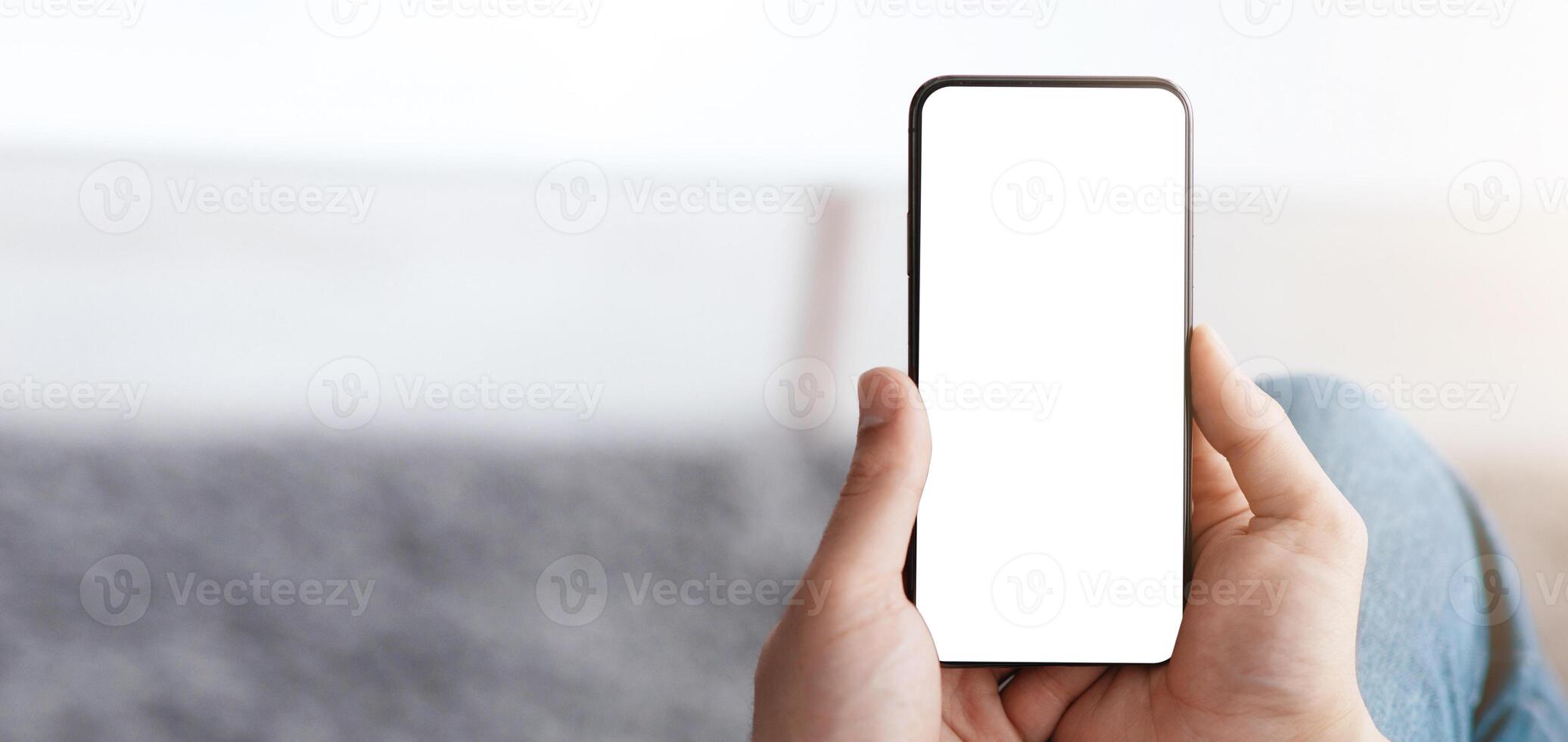 Mockup for website advertisement. Unrecognizable man using smartphone with blank screen, sitting at home, empty space, closeup. Guy making call, surfing internet or chatting in social networks Pro Photo
