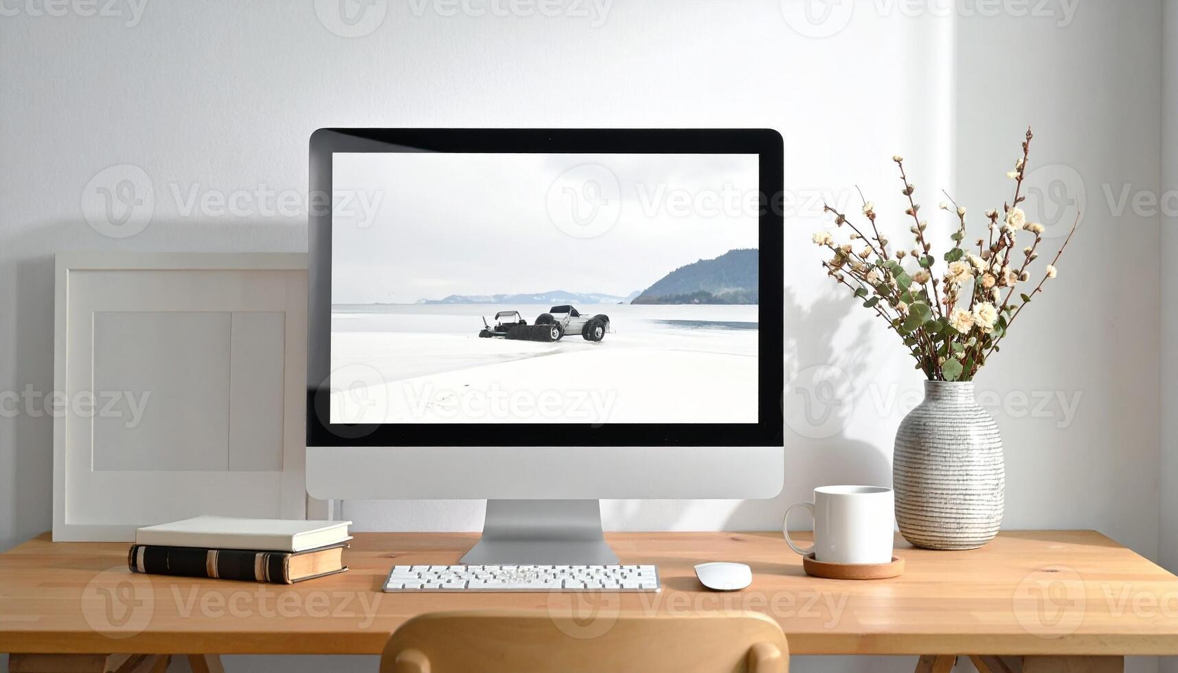 Minimalist workspace setup with desktop computer flowers and natural light. Pro Photo
