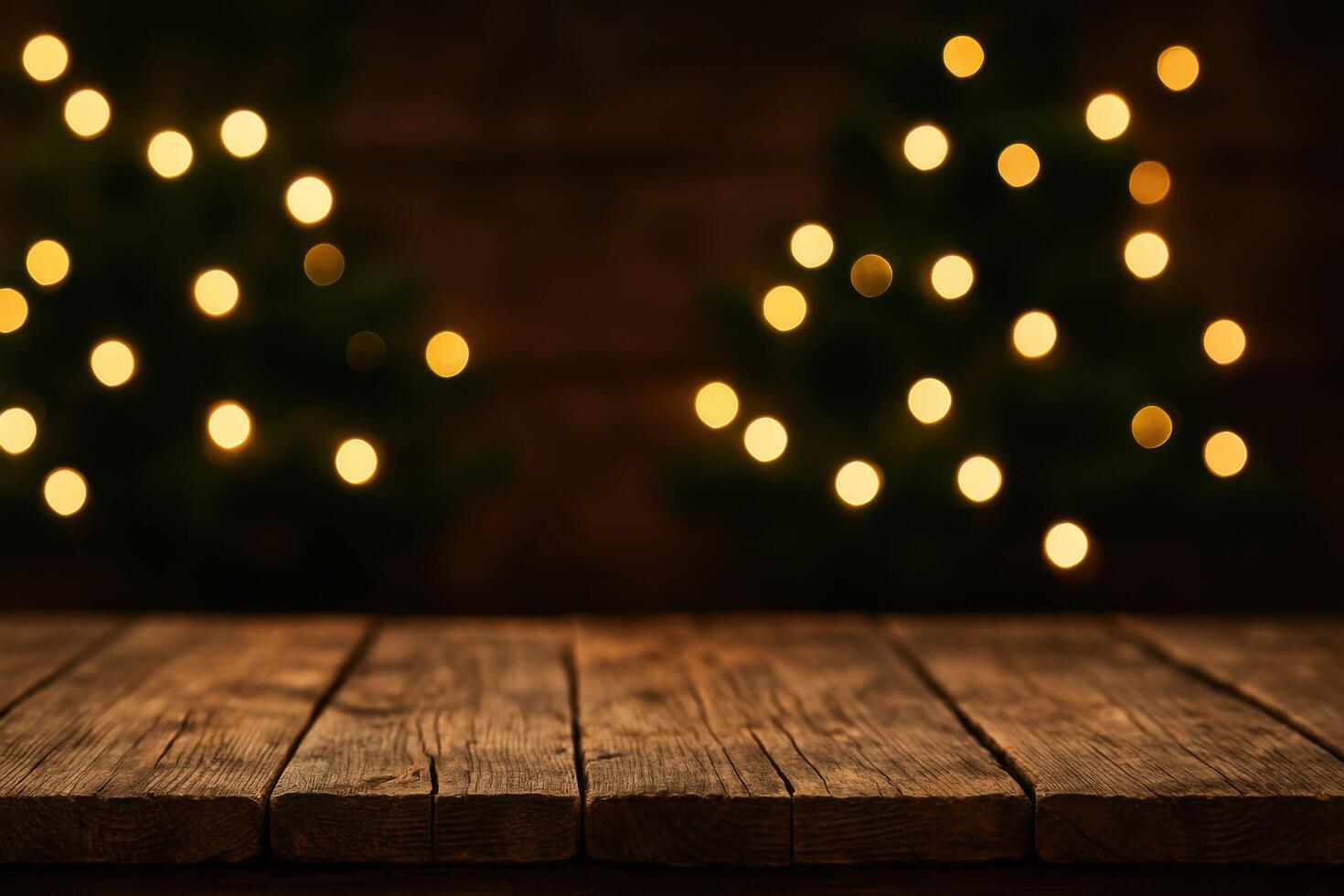 Empty rustic wooden table with festive blurred Christmas tree lights background for product display. photo
