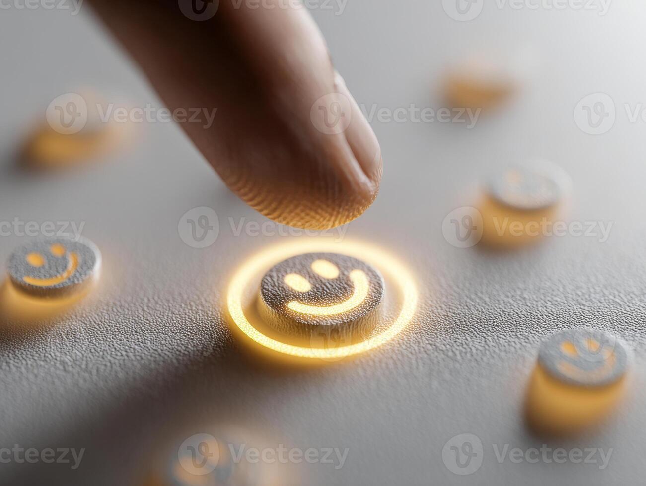 Finger pressing illuminated happy face button among multiple smile icons symbolizing positive feedback and user satisfaction in digital interaction concept Pro Photo