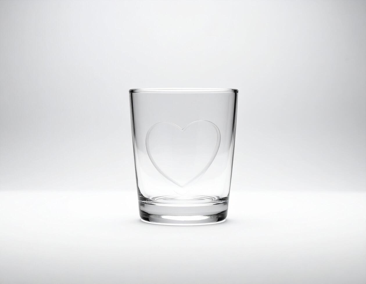Empty glass with heart etching sits on white surface, illuminated by soft light, creating a minimalist and romantic mood. photo