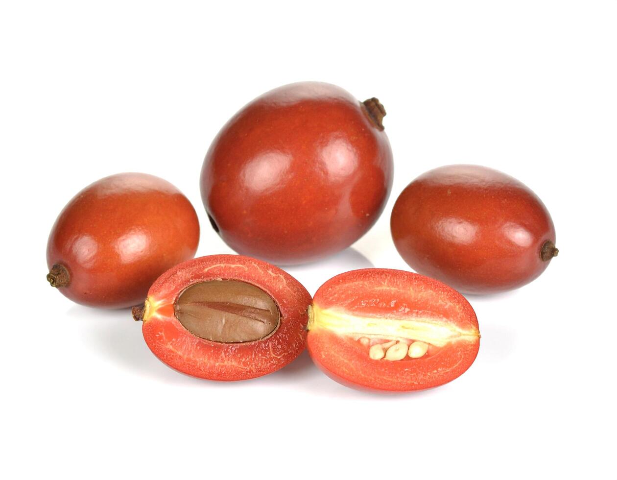 Fresh miracle fruit arranged on white surface showcases vibrant color and unique texture, creating clean and inviting still life composition. photo