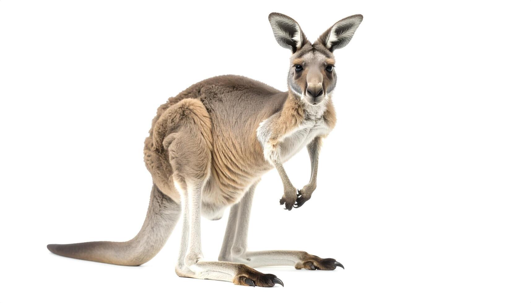 Kangaroo stands upright on a white surface, looking directly at the camera with its large ears perked, showcasing its unique posture and curious expression. Free Photo