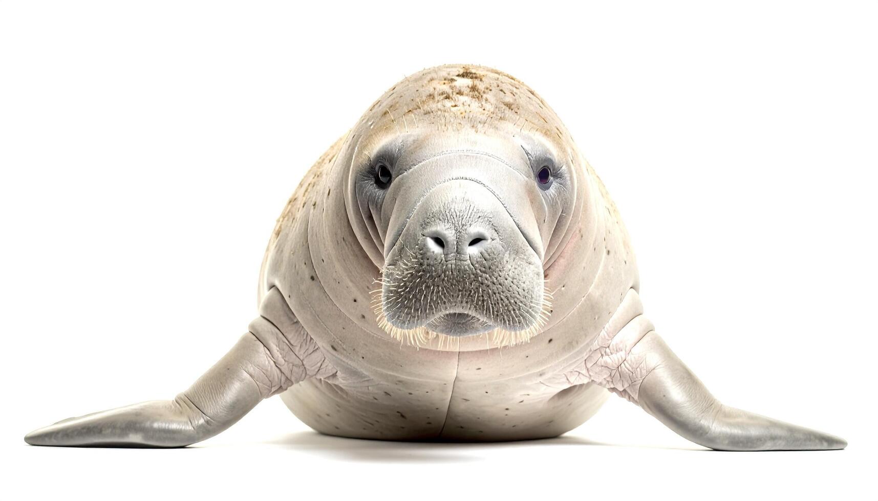 Gentle manatee poses on white background, showcasing its smooth skin and endearing face, creating a serene and captivating image. Free Photo