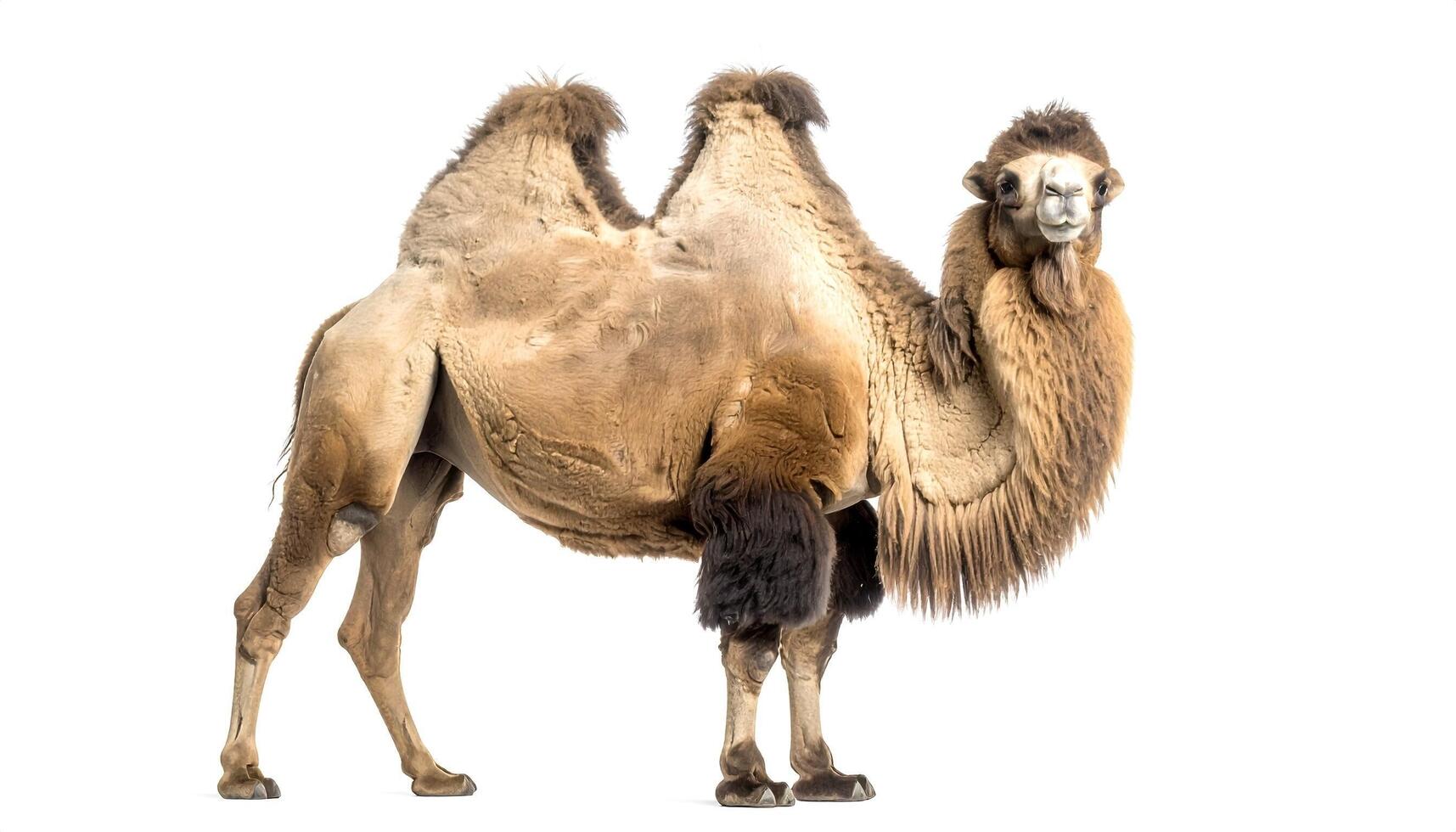 Majestic bactrian camel stands calmly against a white backdrop, showcasing its thick fur and two humps in a studio setting, creating a peaceful and informative atmosphere. photo