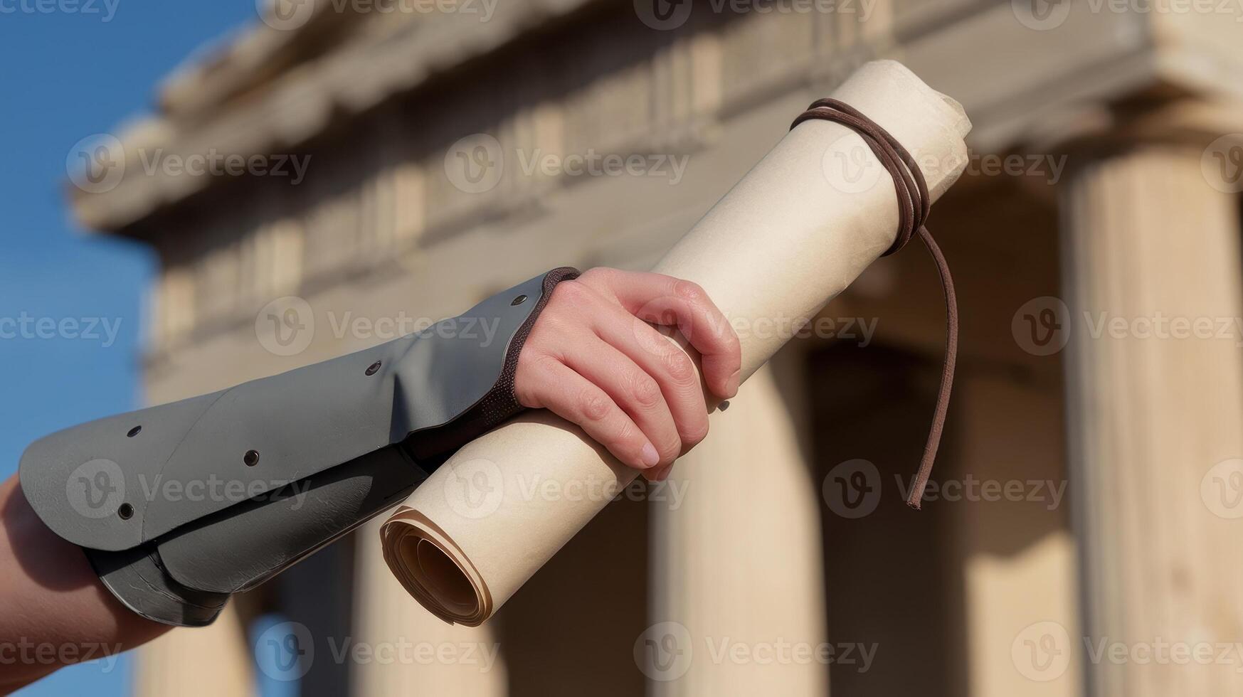 Hand Holding Scroll With Building Columns in Athens, Greece on Sunny Day Pro Photo