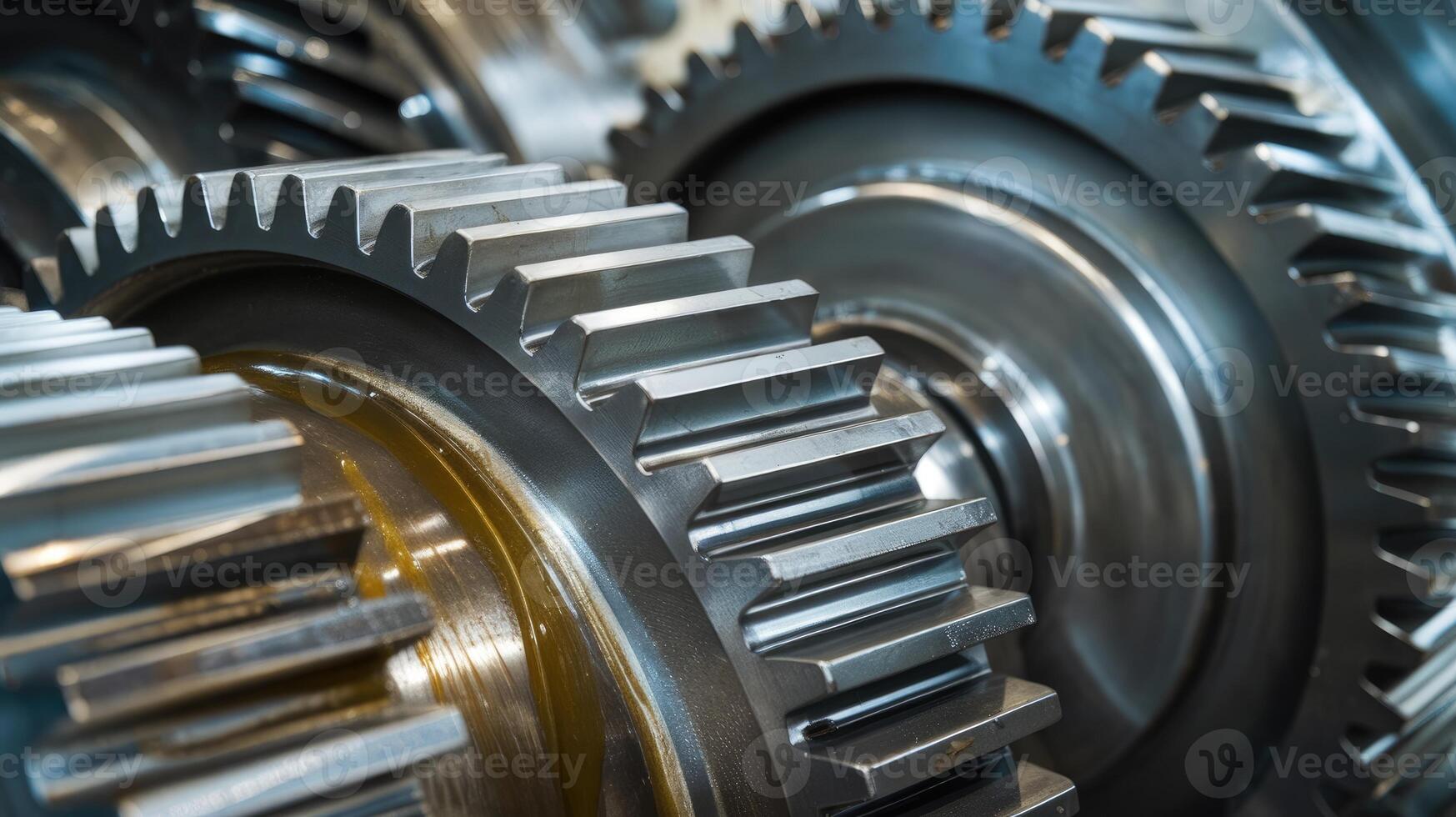 Close View Showing Interlocking Shiny Metal Gears in a Complex Mechanical System Pro Photo