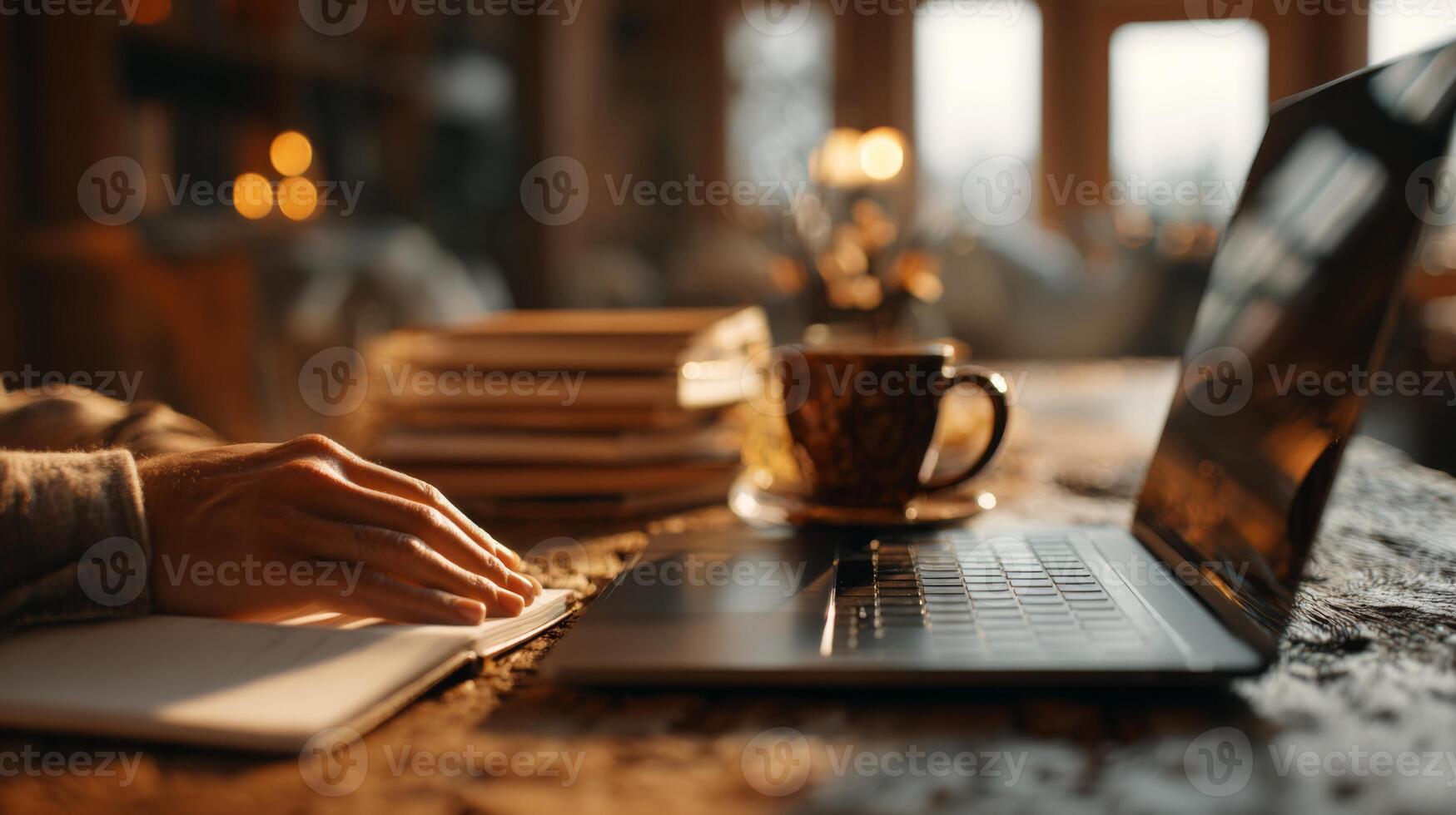 A cozy workspace featuring a hand on a notebook beside a laptop and a warm cup of coffee, creating an inviting and productive atmosphere. Pro Photo