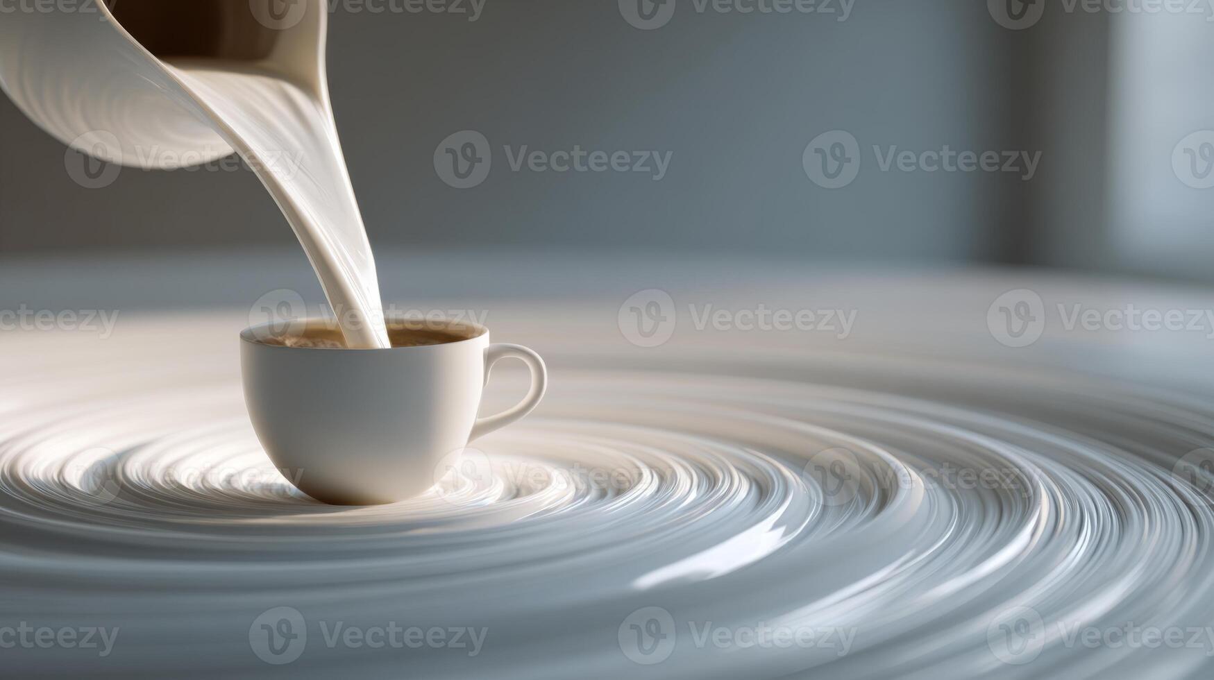 A serene image of creamy milk being poured into a white cup, creating beautiful swirling patterns on a smooth surface. Pro Photo