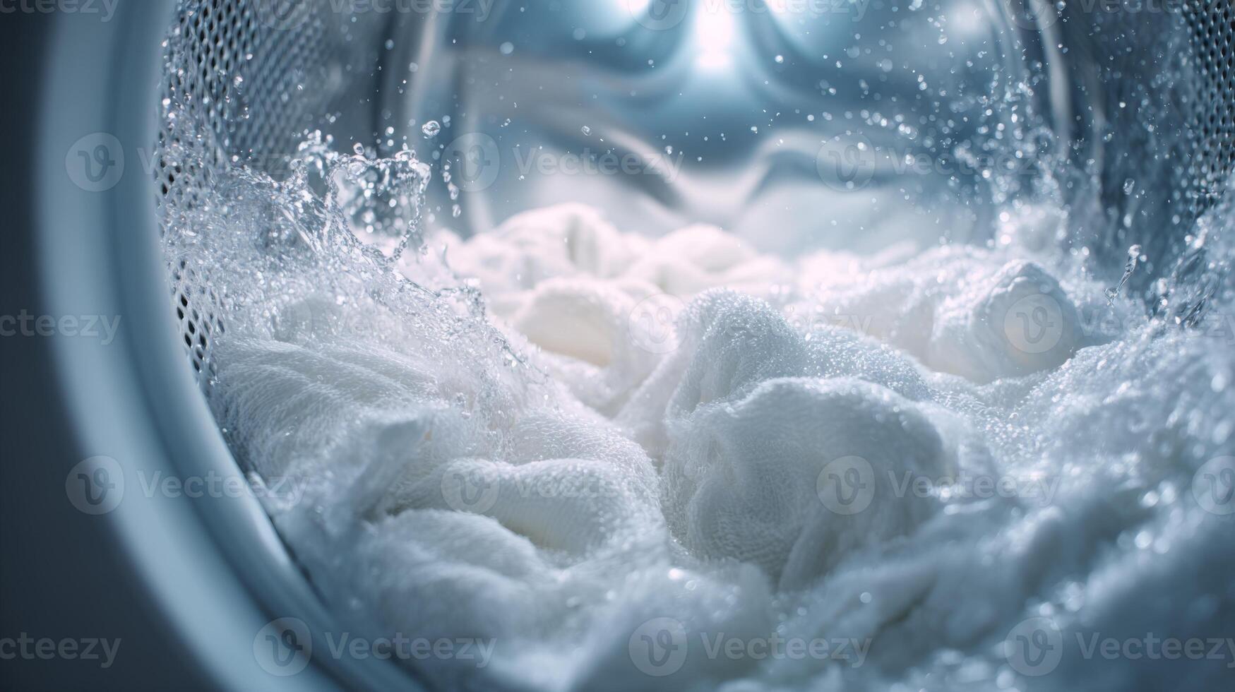A close-up view of swirling, soapy laundry in a washing machine, capturing the dynamic bubbles and textures. Pro Photo