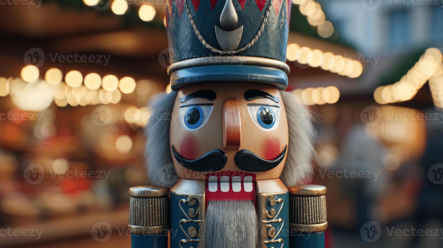 A close-up of a colorful wooden nutcracker soldier with charming features, set against a warm, festive backdrop with soft lights. Pro Photo