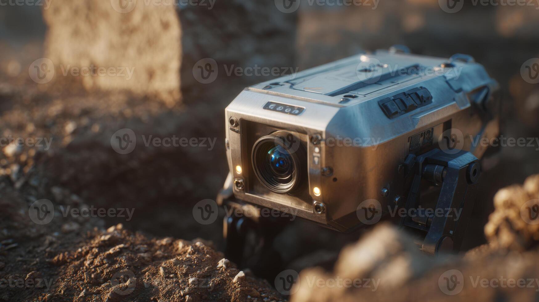 A futuristic robotic camera exploring rugged terrain, showcasing advanced technology and design. Pro Photo