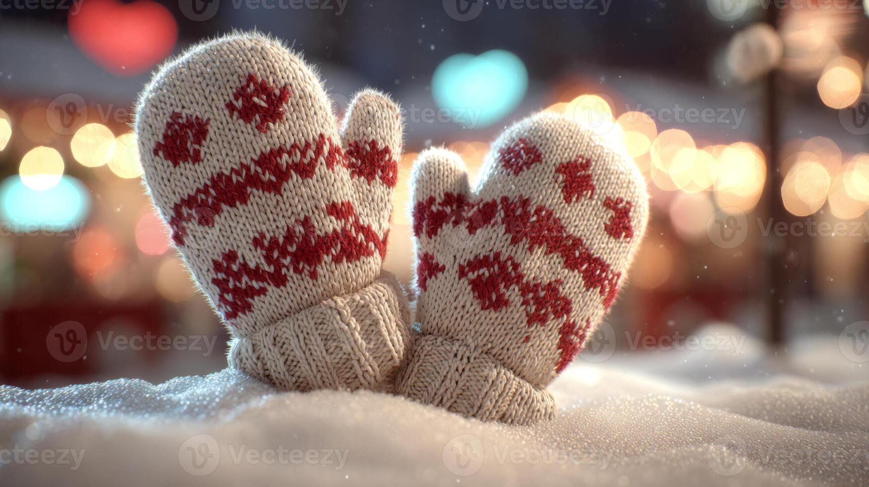 Warm knitted mittens resting on snow, adorned with festive patterns, creating a cozy winter atmosphere. Pro Photo