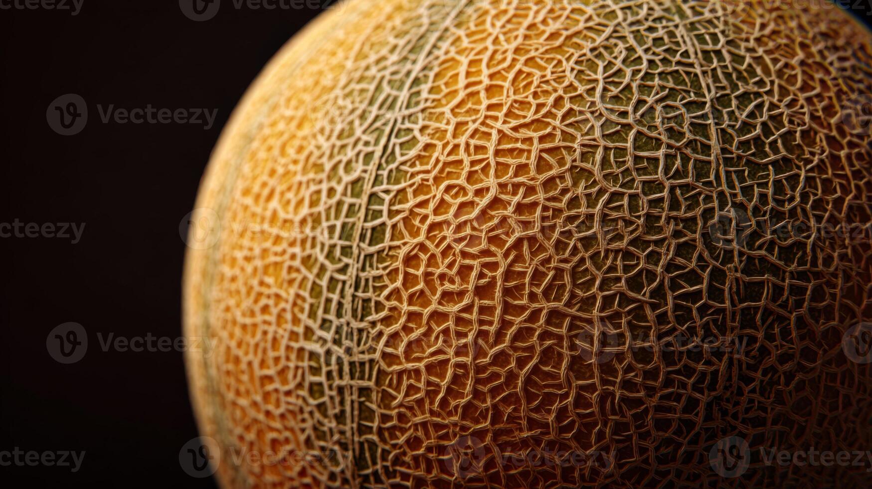 A close-up shot of a cantaloupe revealing its textured rind and intricate network of cracks against a dark background. Pro Photo