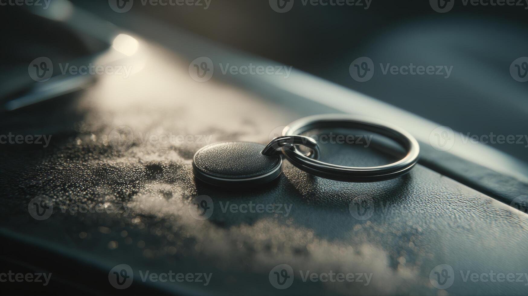Close-up of a silver keychain resting on a textured surface with subtle condensation, evoking a serene, contemplative atmosphere. Pro Photo
