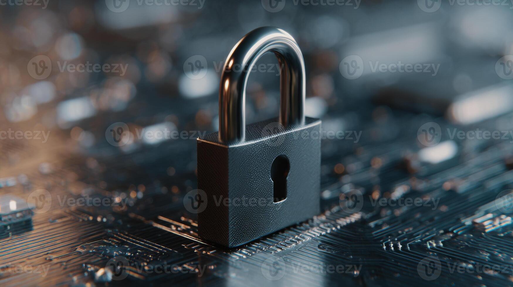 A metallic padlock stands prominently against a blurred circuit board background, symbolizing cybersecurity and data protection. Pro Photo