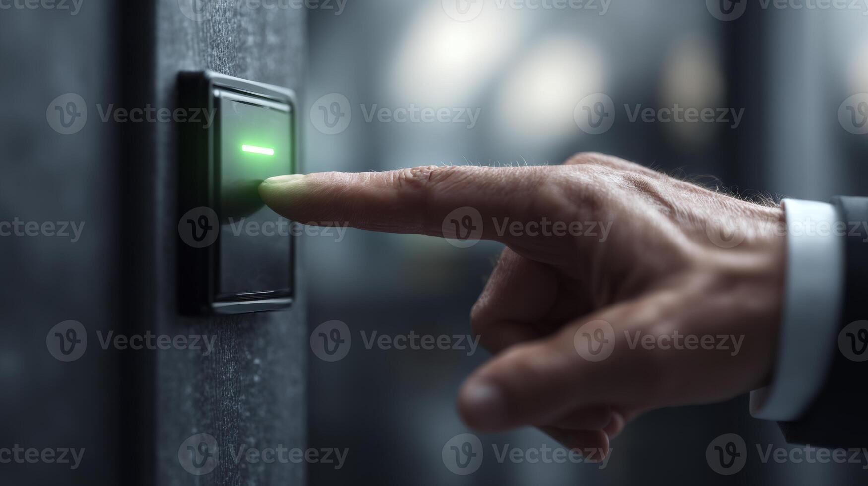 A close-up of a male hand pressing a biometric access control button in a modern environment. Pro Photo