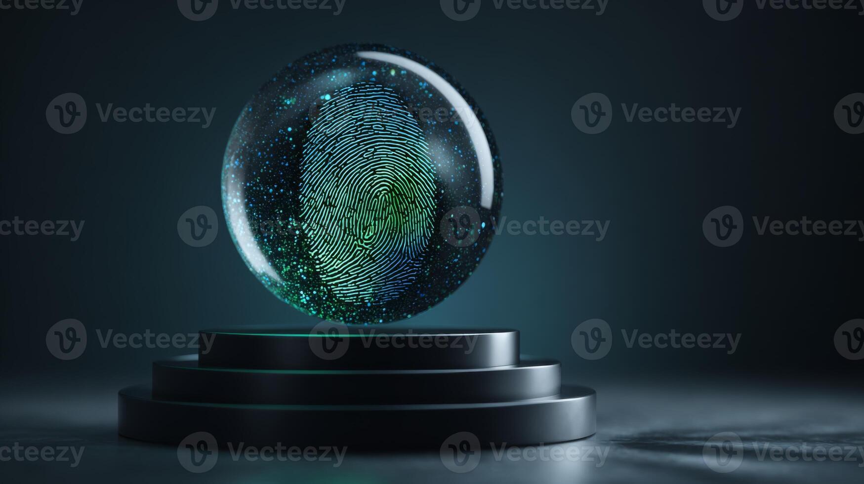 A mesmerizing fingerprint encapsulated in a translucent orb, radiating blue and green hues, highlighting identity and uniqueness. Pro Photo