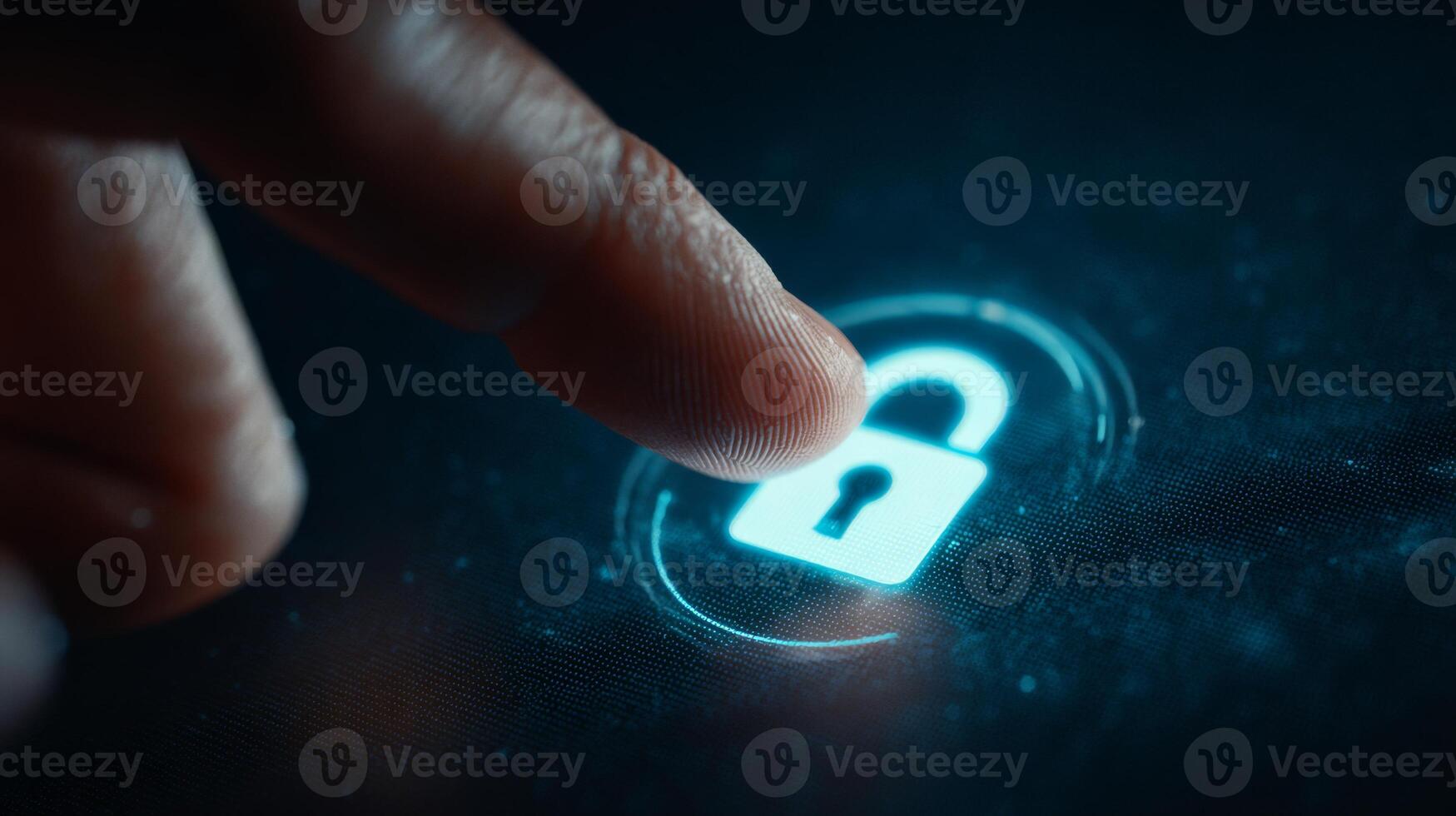 A close-up of a finger pressing a digital lock icon, symbolizing cybersecurity and data protection. Pro Photo