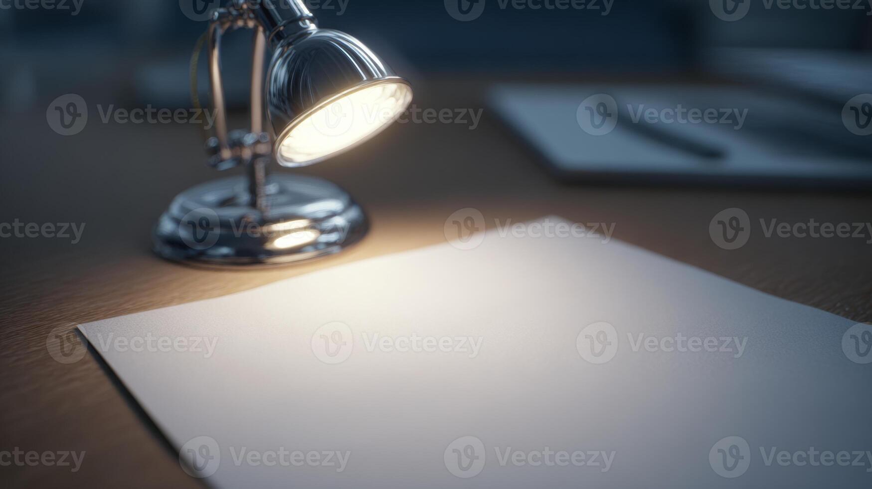 A sleek, silver desk lamp illuminates a blank sheet of paper on a wooden surface, creating a serene and focused atmosphere. Pro Photo