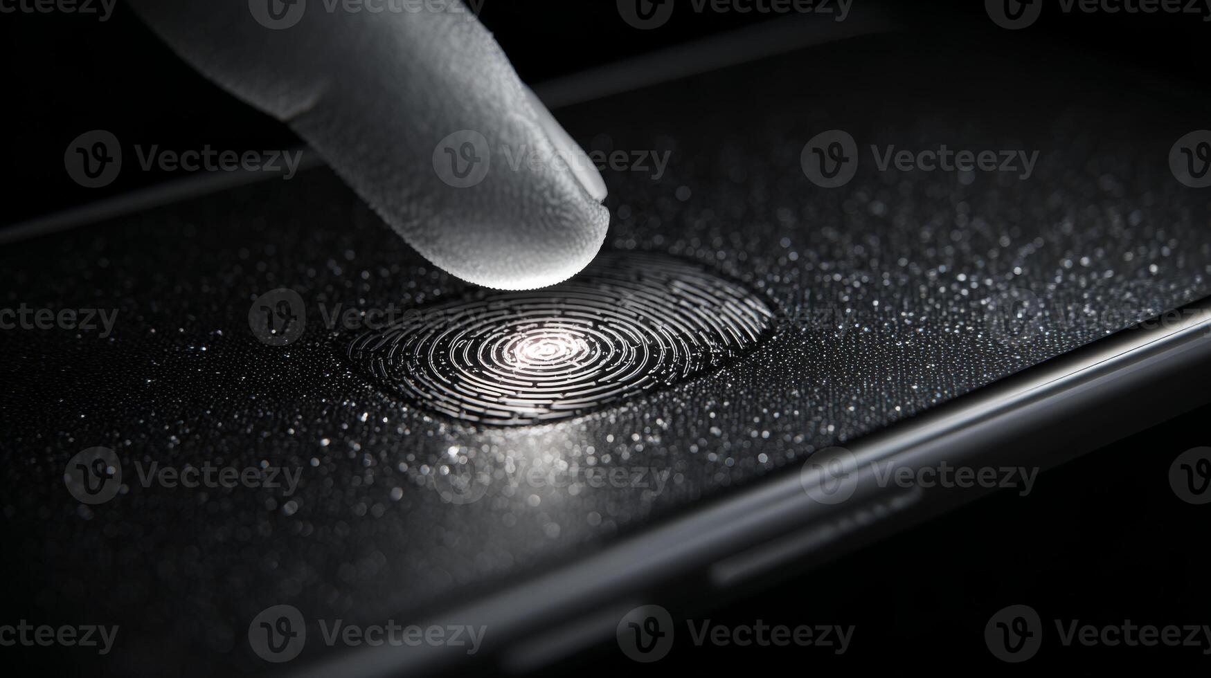 A close-up of a finger poised over a smartphone's fingerprint sensor, showcasing modern technology and security features. Pro Photo