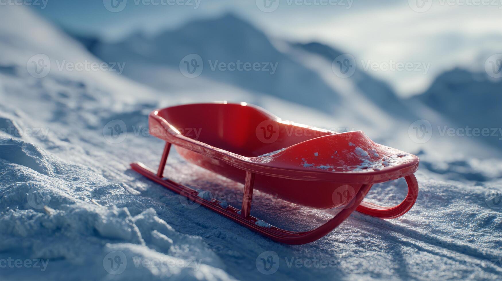 A bright red sled rests atop a blanket of pristine snow, with majestic mountains in the background, capturing a joyful winter scene. Pro Photo