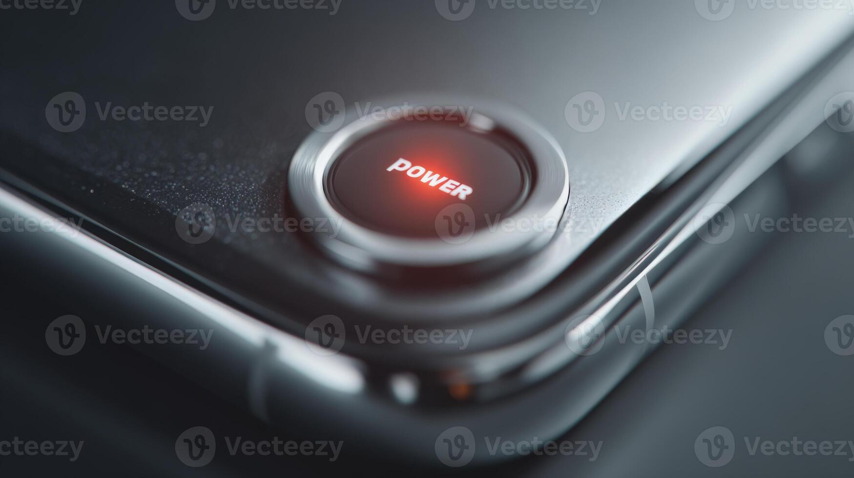 Close-up of a sleek power button on a modern device, illuminated in red, showcasing its minimalist design. Pro Photo