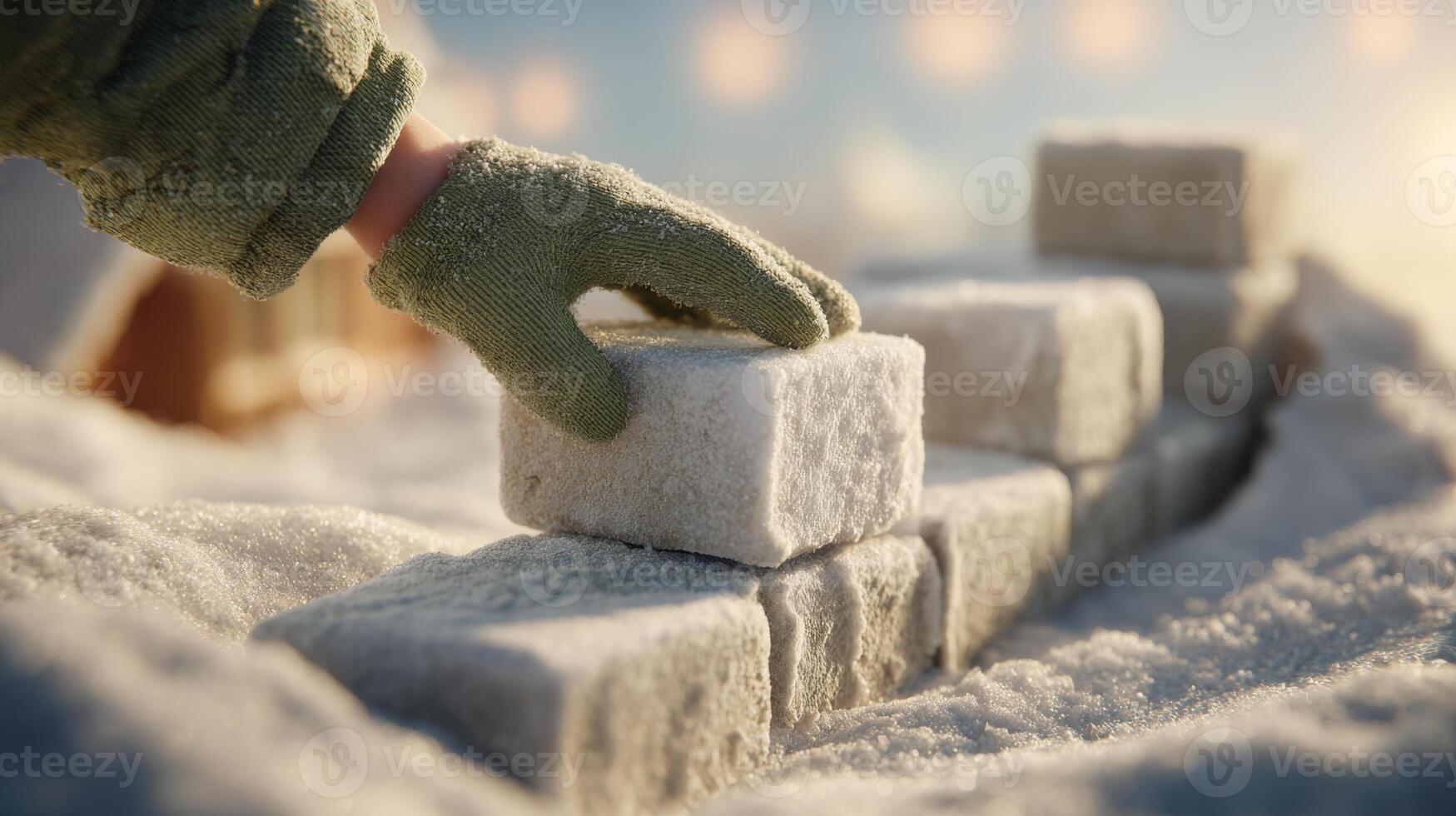 A close-up of a gloved hand stacking snow blocks in a wintery scene, surrounded by soft snow and a warm, glowing background. Pro Photo