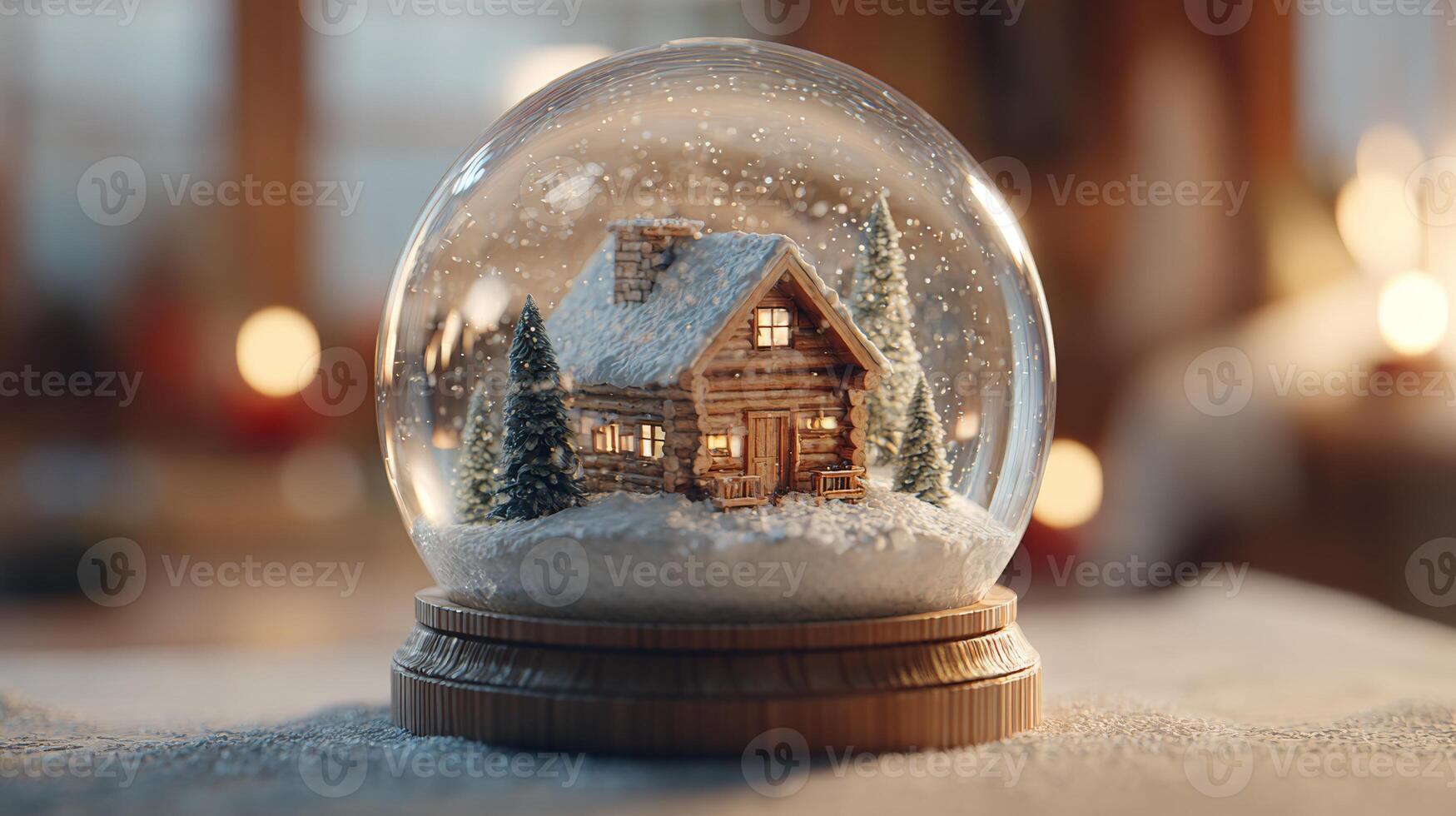 A charming snow globe featuring a cozy log cabin surrounded by evergreen trees, creating a magical winter atmosphere. Pro Photo