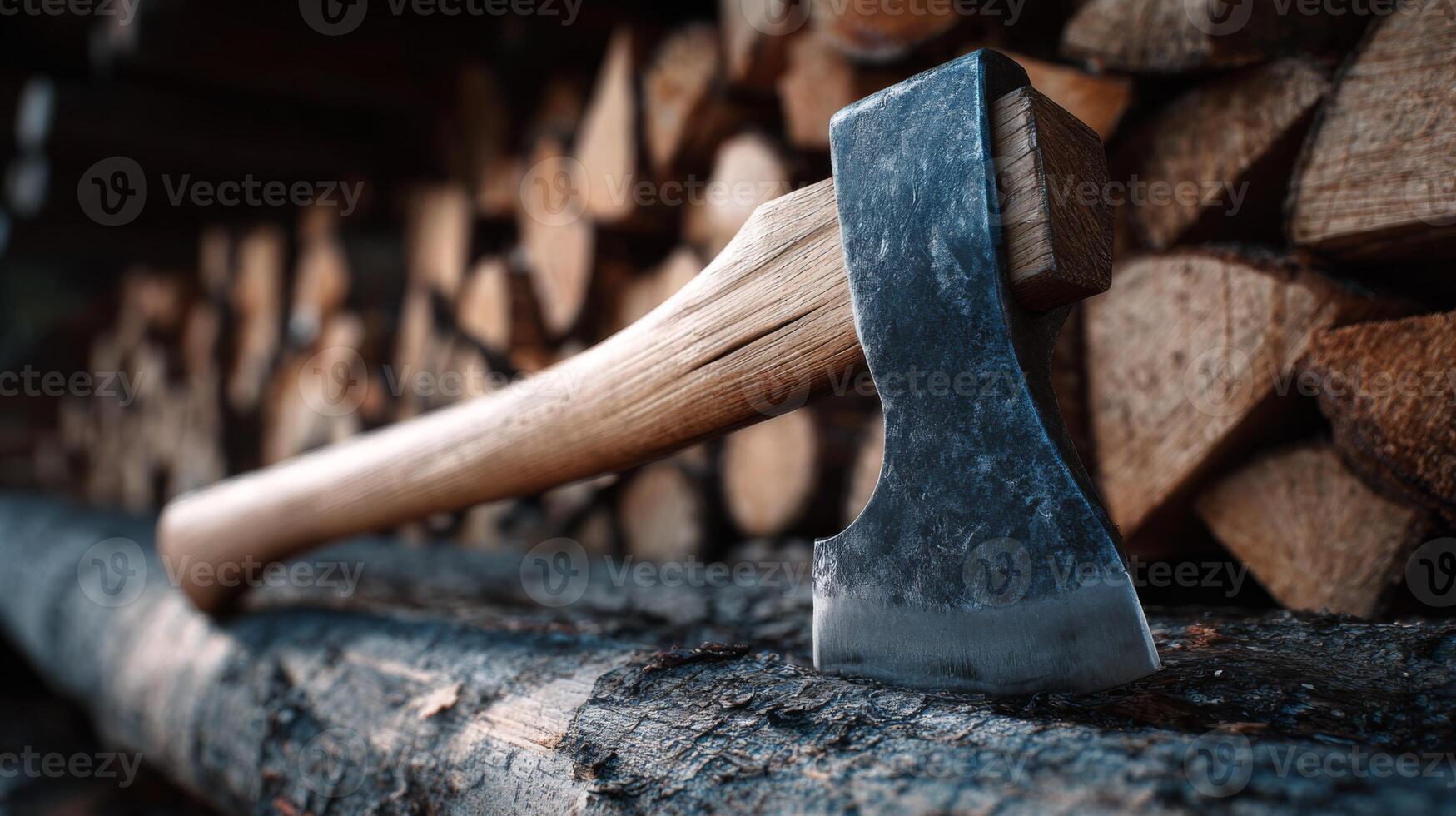 A close-up of a rustic axe resting on a log, with neatly stacked firewood in the background, evoking a sense of outdoor craftsmanship. Pro Photo